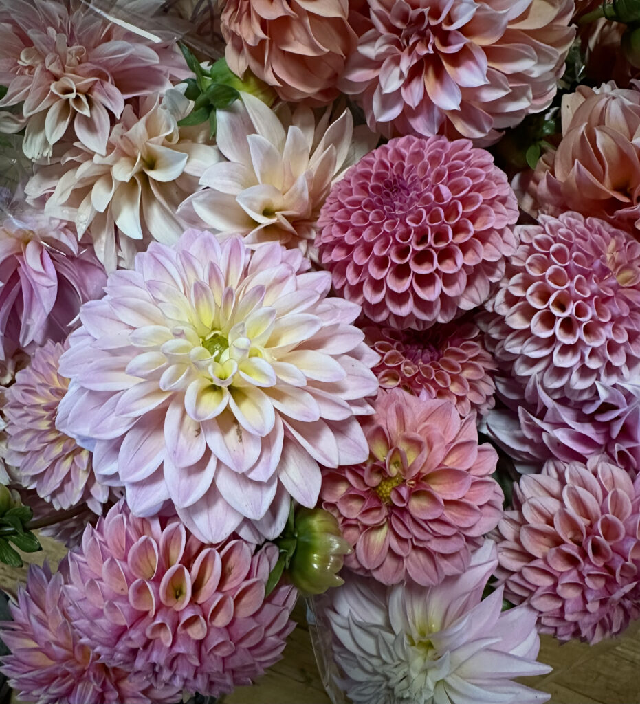 Above are a few of last year’s fall bouquets, with zinnias, dahlias, lisianthus, and raspberry leaf.